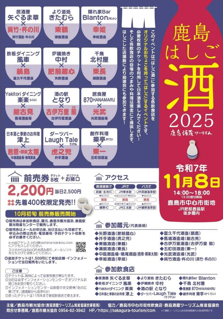 徒歩圏内にある複数の参加飲食店と、鹿島市内・市外の酒蔵がコラボします!