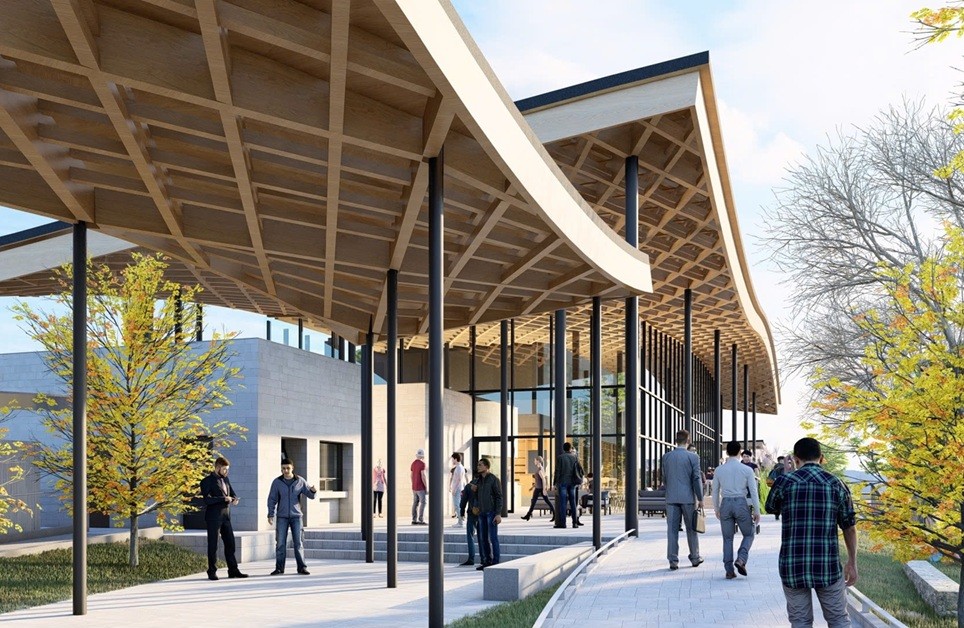 新駅舎 鹿島錦の「織」をイメージした大屋根/県整備/えきやど・カフェ・セレクトショップ改札・ラウンジ