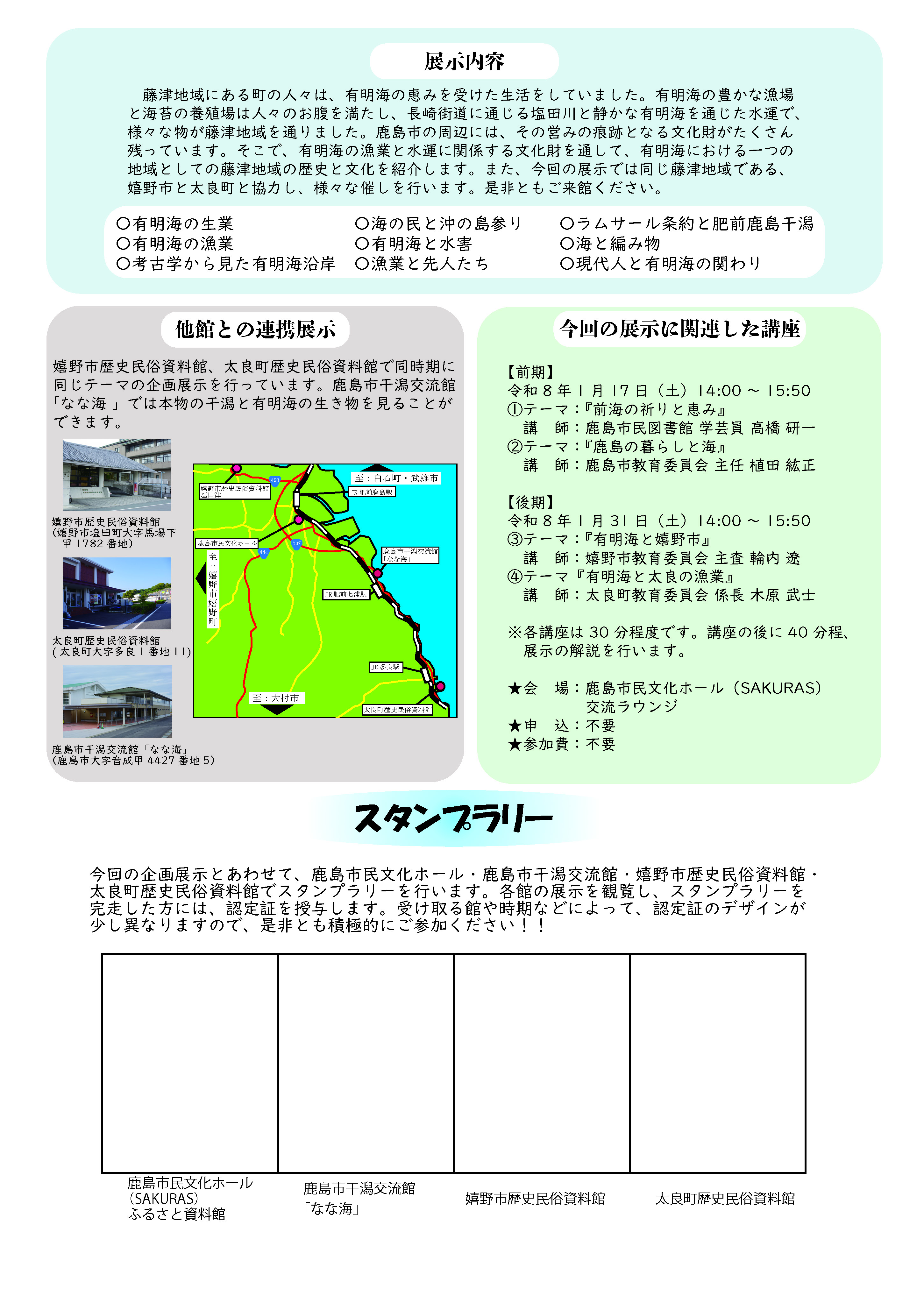 鹿島市民文化ホール、鹿島市干潟交流館、嬉野市歴史民俗資料館、太良町歴史民俗資料館に
