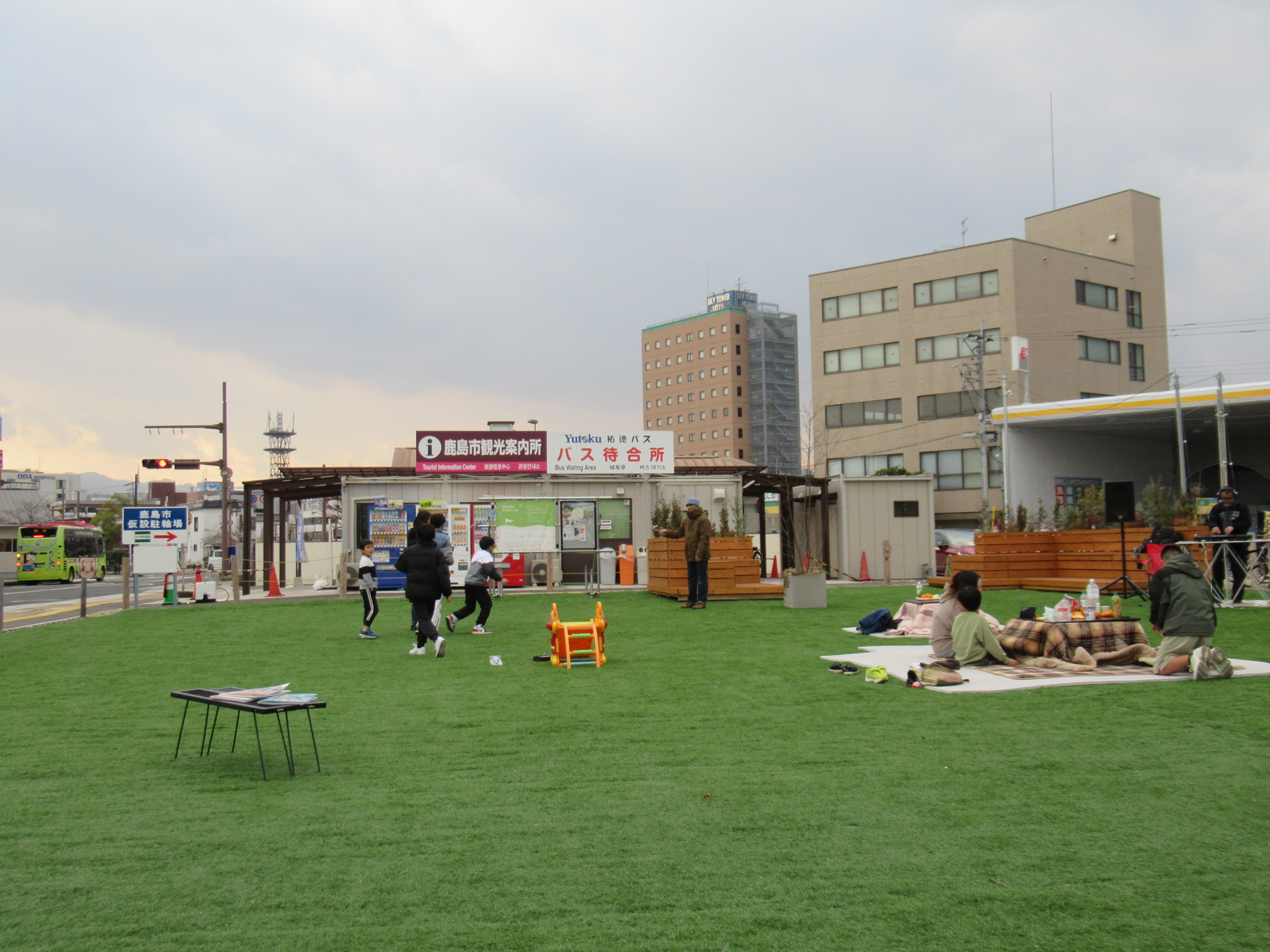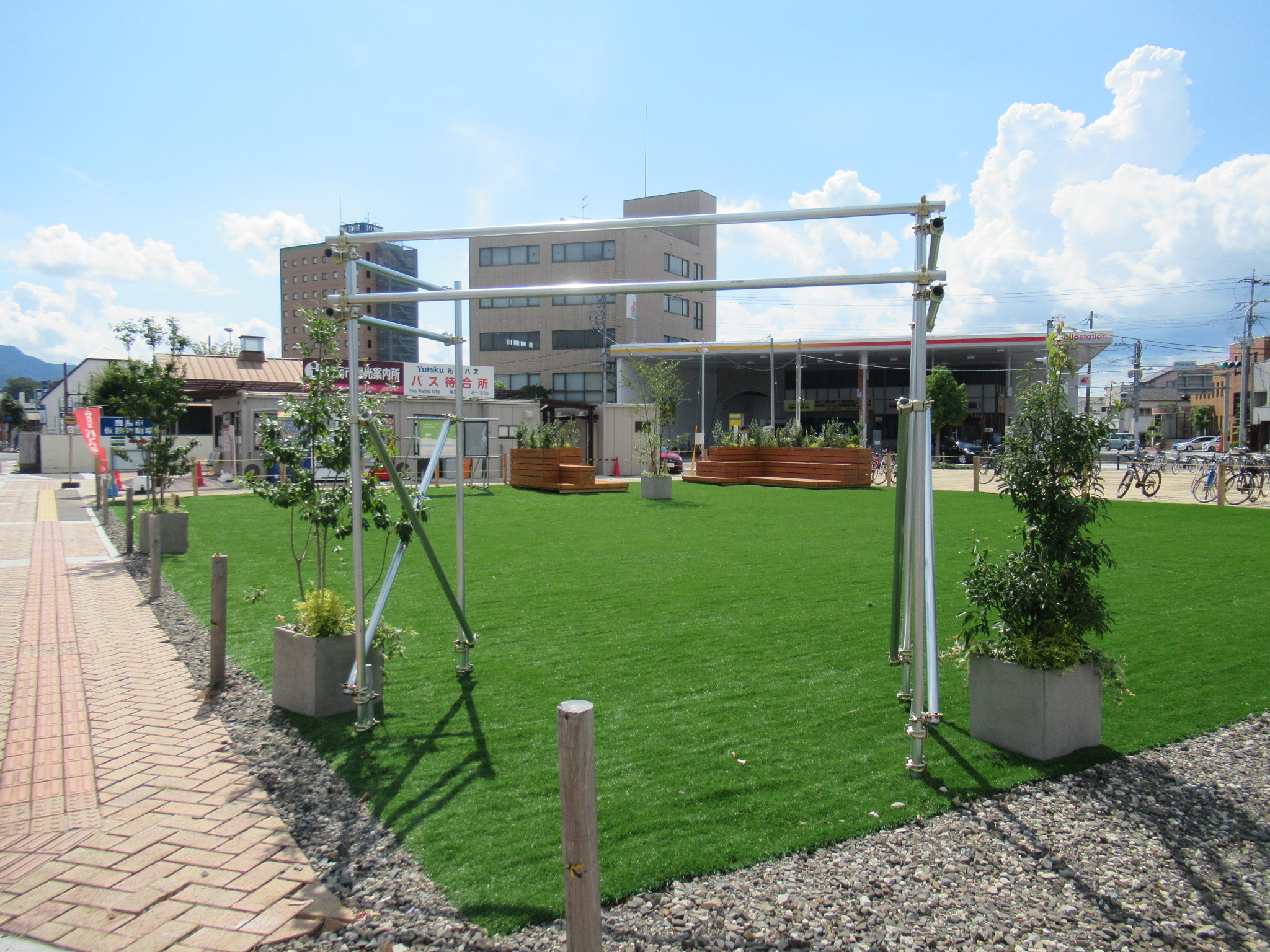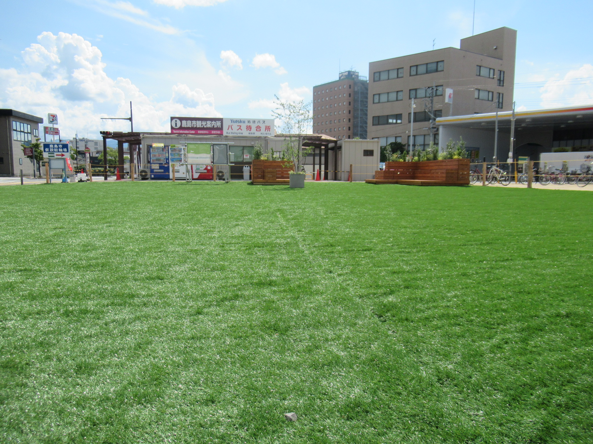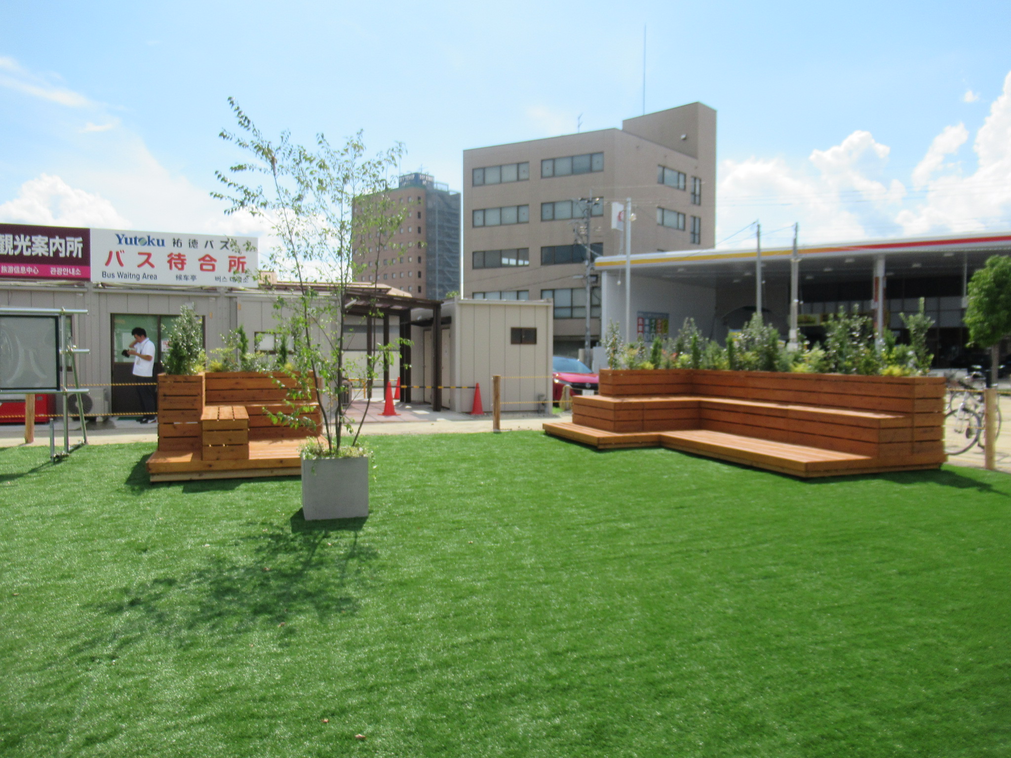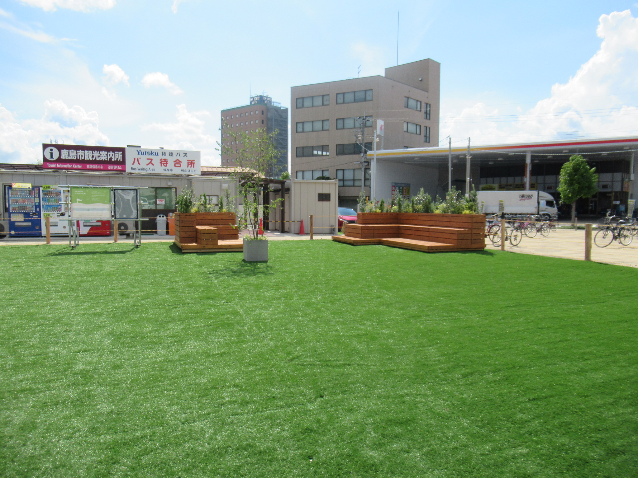 肥前鹿島駅前の仮設広場は、新しい肥前鹿島駅エリアの整備期間中の社会実験の場として、一時的に設置する「地域に開かれた芝生広場」です。