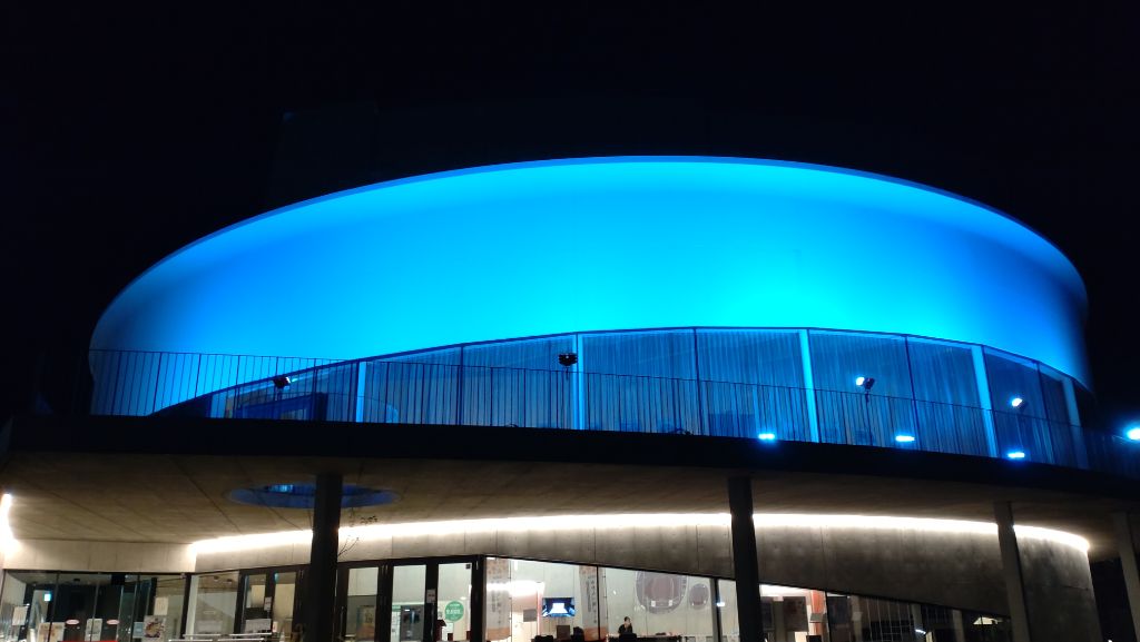 世界ろう連盟や国連のロゴの色(平和を表す象徴的な色)である青色で、市民文化ホールSAKURASをライトアップします。