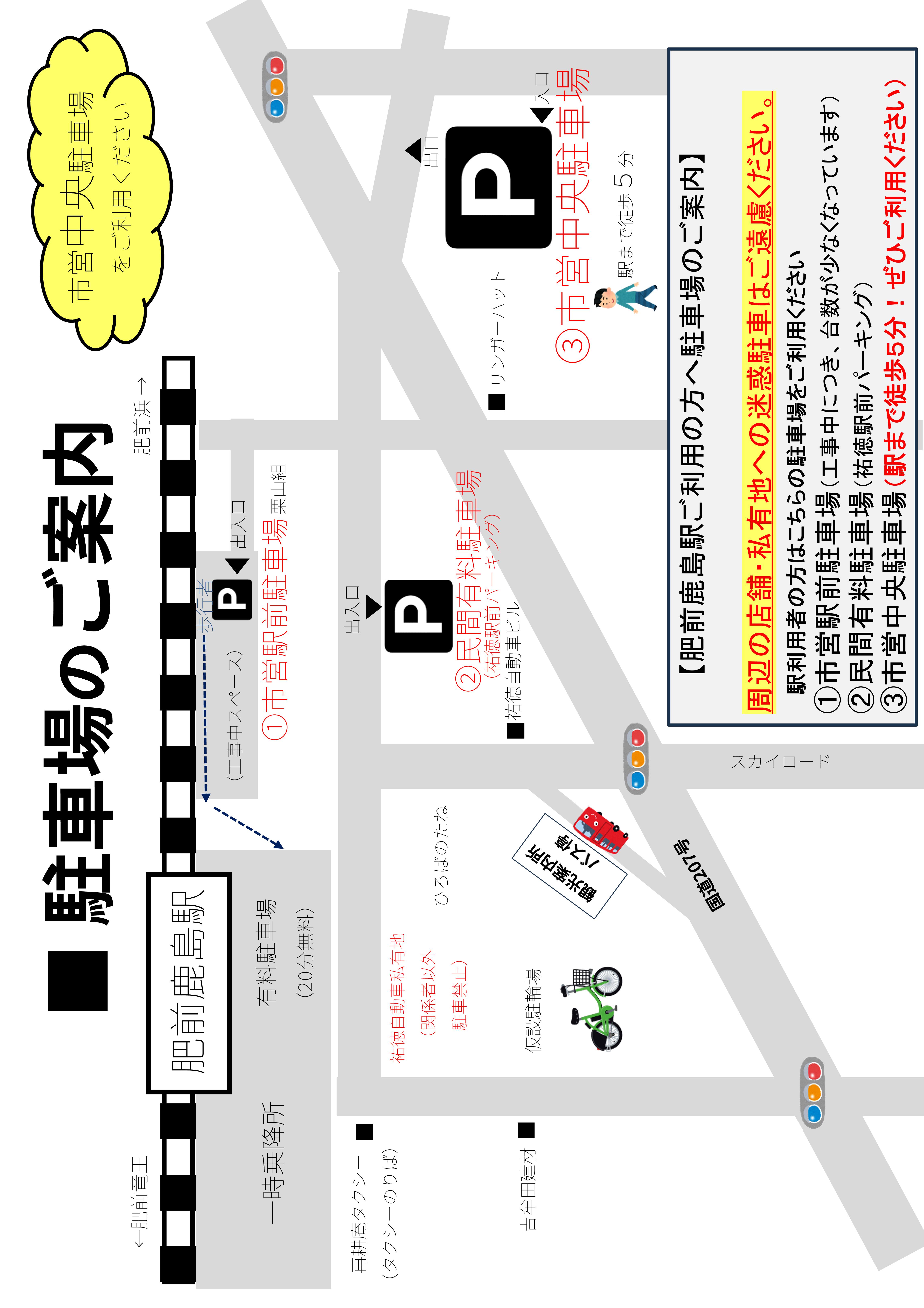 駅利用者の方は当面ご不便をおかけしますが、市営中央駐車場または民間の駐車場をご利用ください。