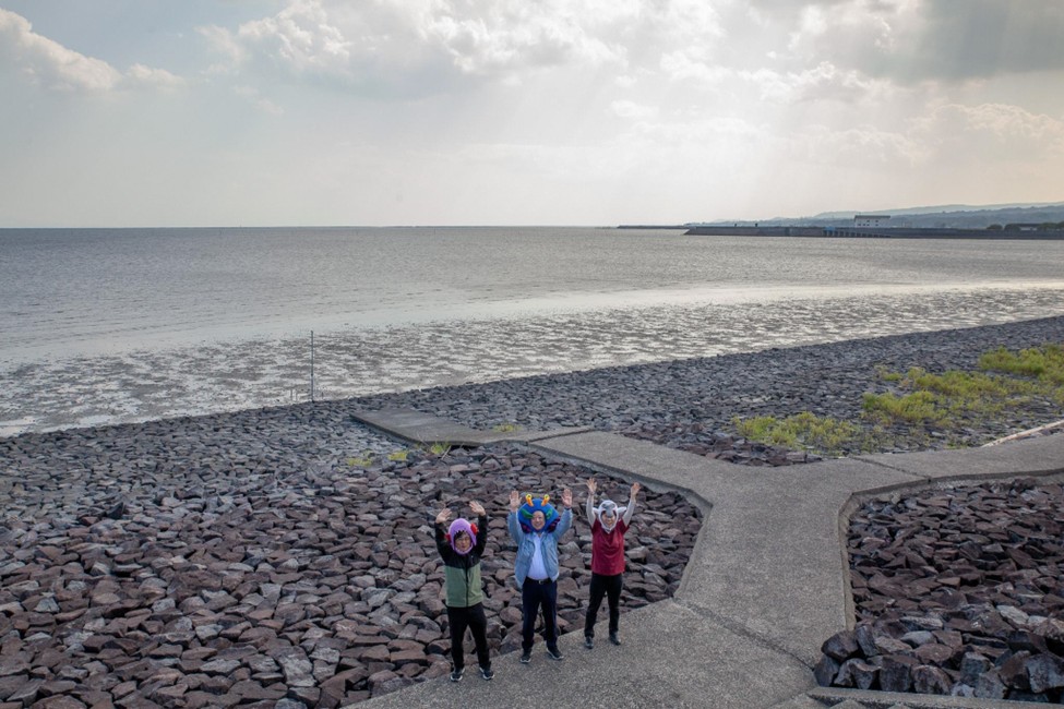 振り返ると海岸の手前に田んぼ。そのすぐ奥に、低山が連なる佐賀らしい景色です。