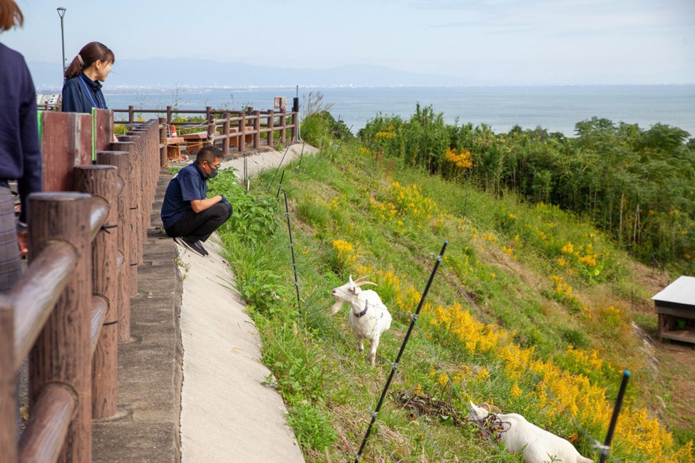 海道しるべの外の景色。海のすぐ側。小高い丘の上に、穏やかな農村風景が連なります。ヤギも飼っています。