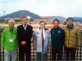 [写真]左から木原鹿島市体育協会会長、青葉関東学連会長、樋口鹿島市長、谷川コーチ(東洋大学)、西駅伝監督(明治大学)(平成23年当時)